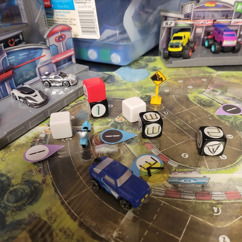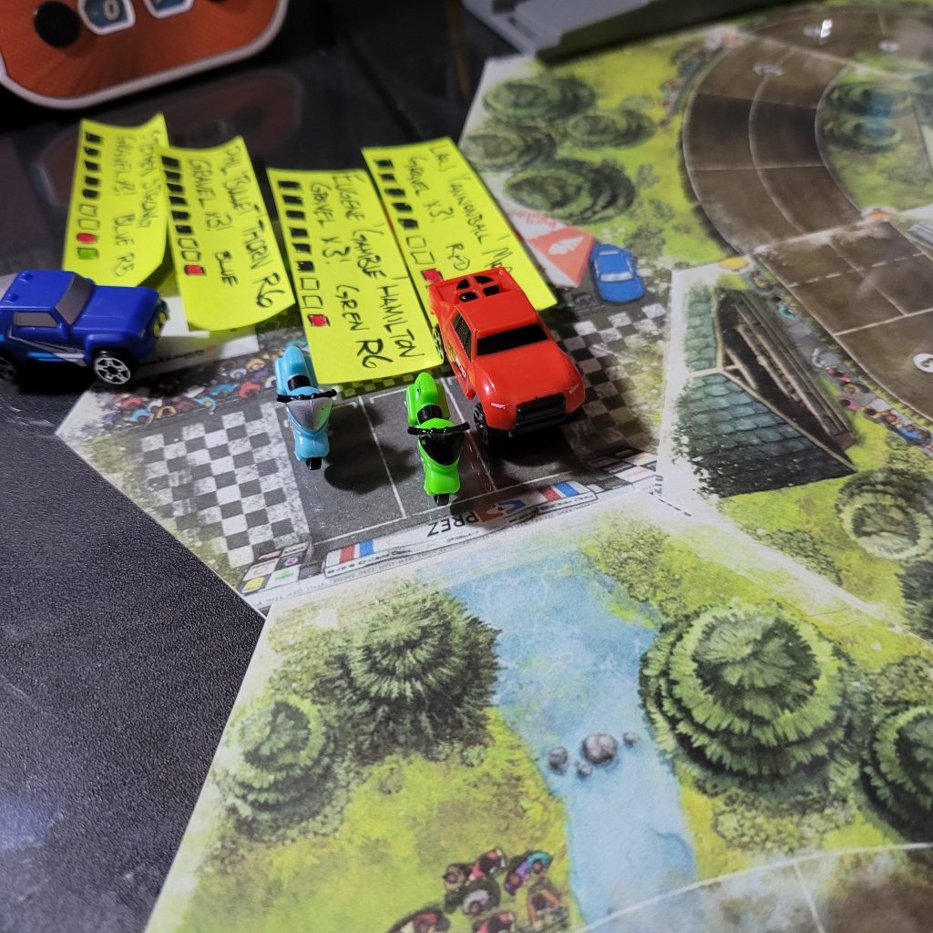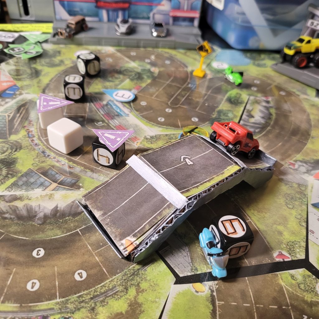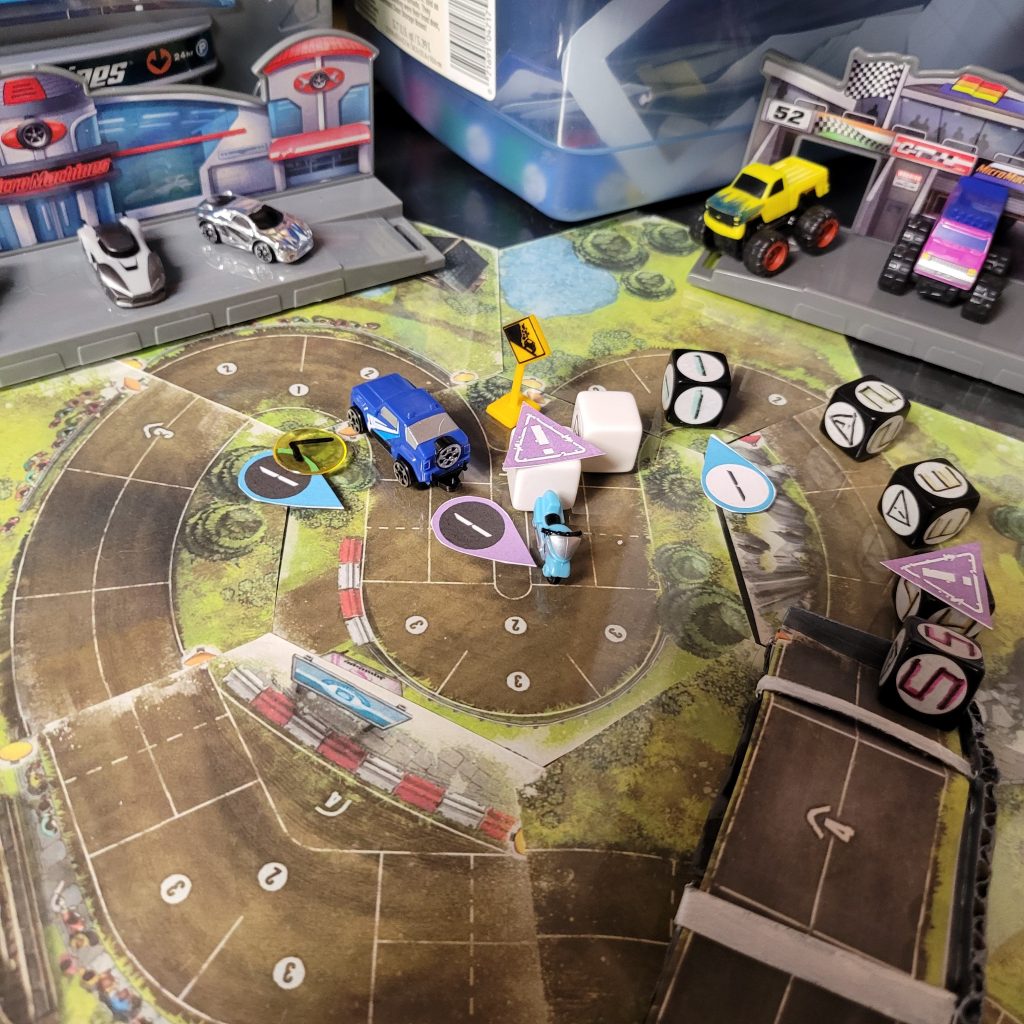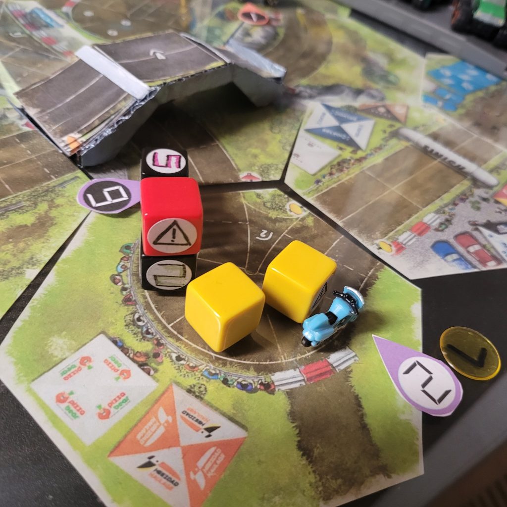 • HEATED WHEELS: All racers go FLAT OUT each turn but gain no Focus. Course trajectory is laid out after the roll is made, and caution results are still observed.