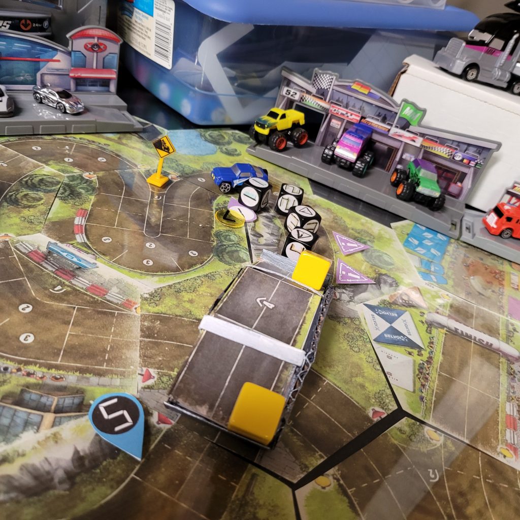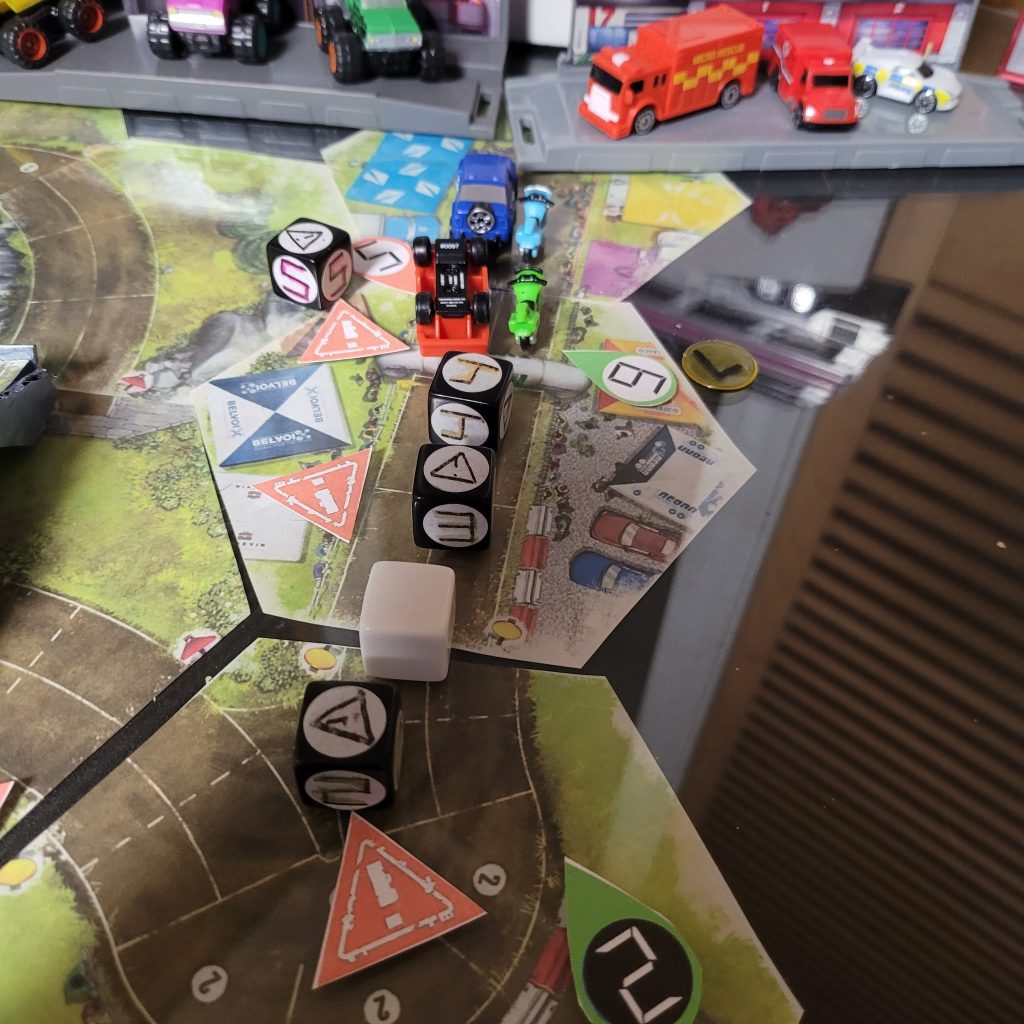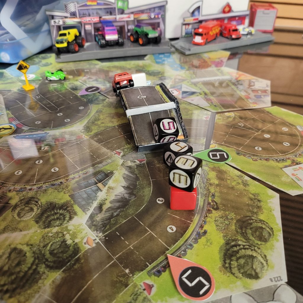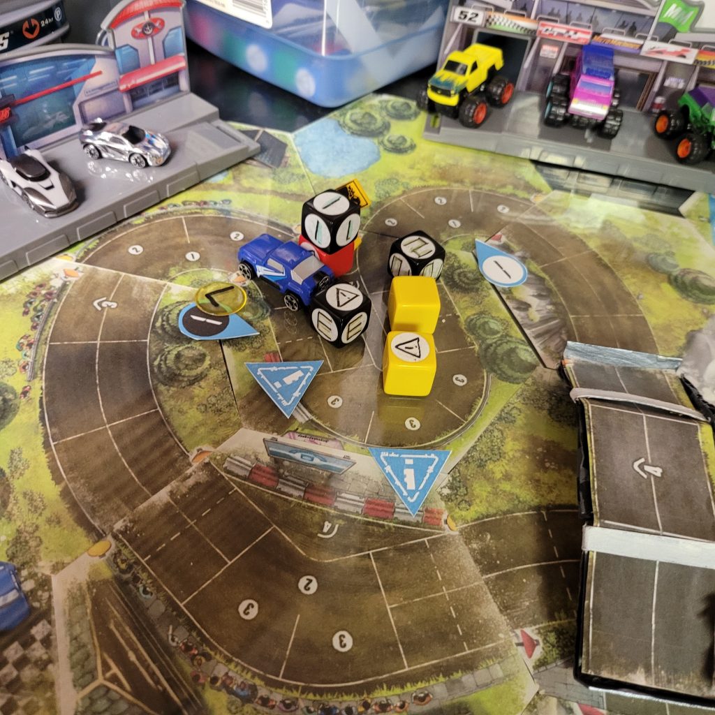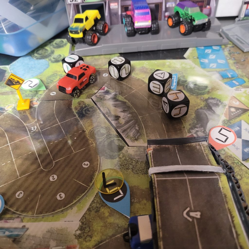 There’s a water hazard up ahead, and you can only be in gear 1 or coast to get through the space, and leader dice are just spicier coast dice with an extra caution result.