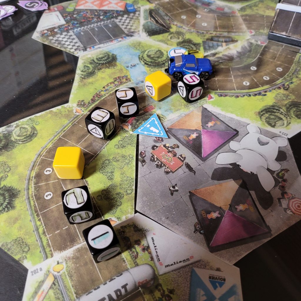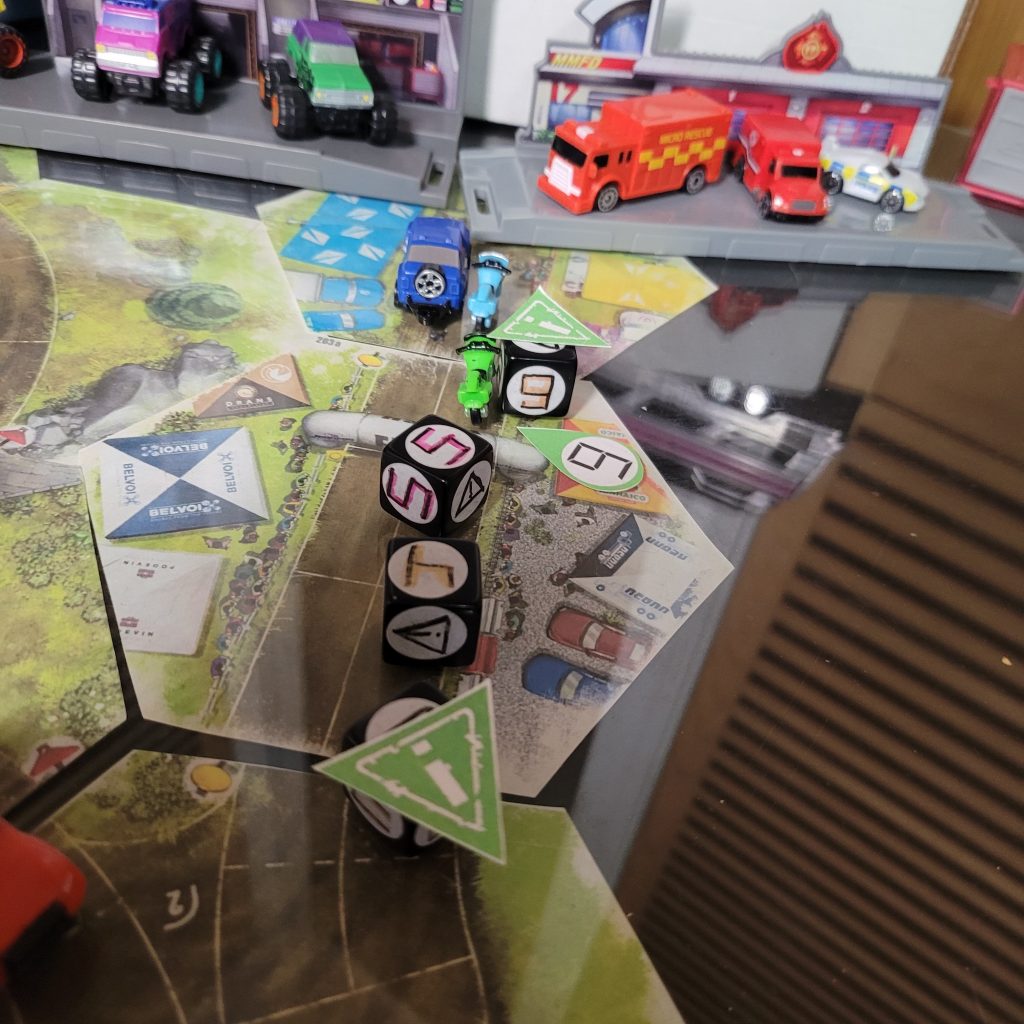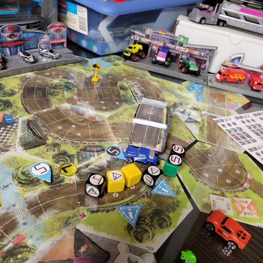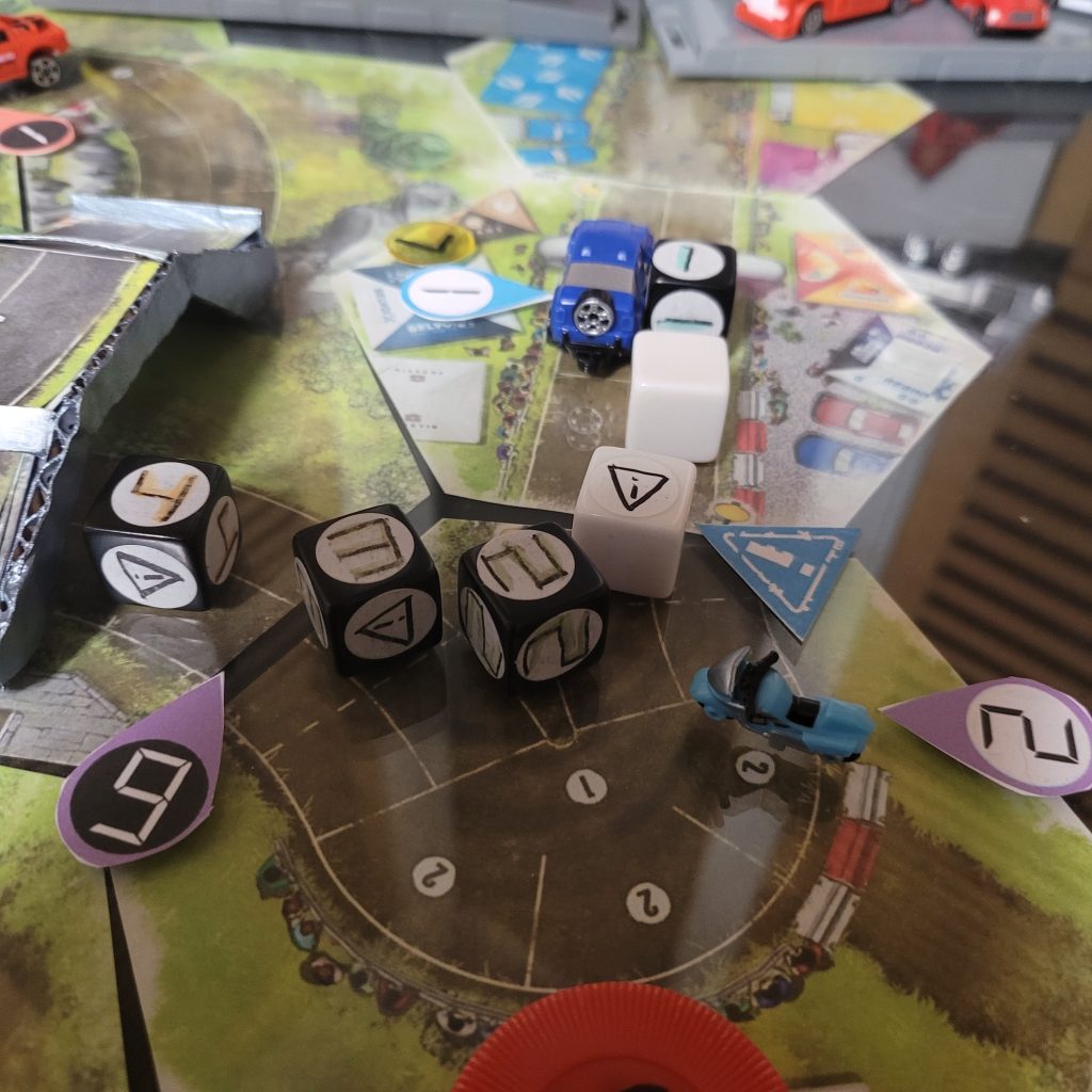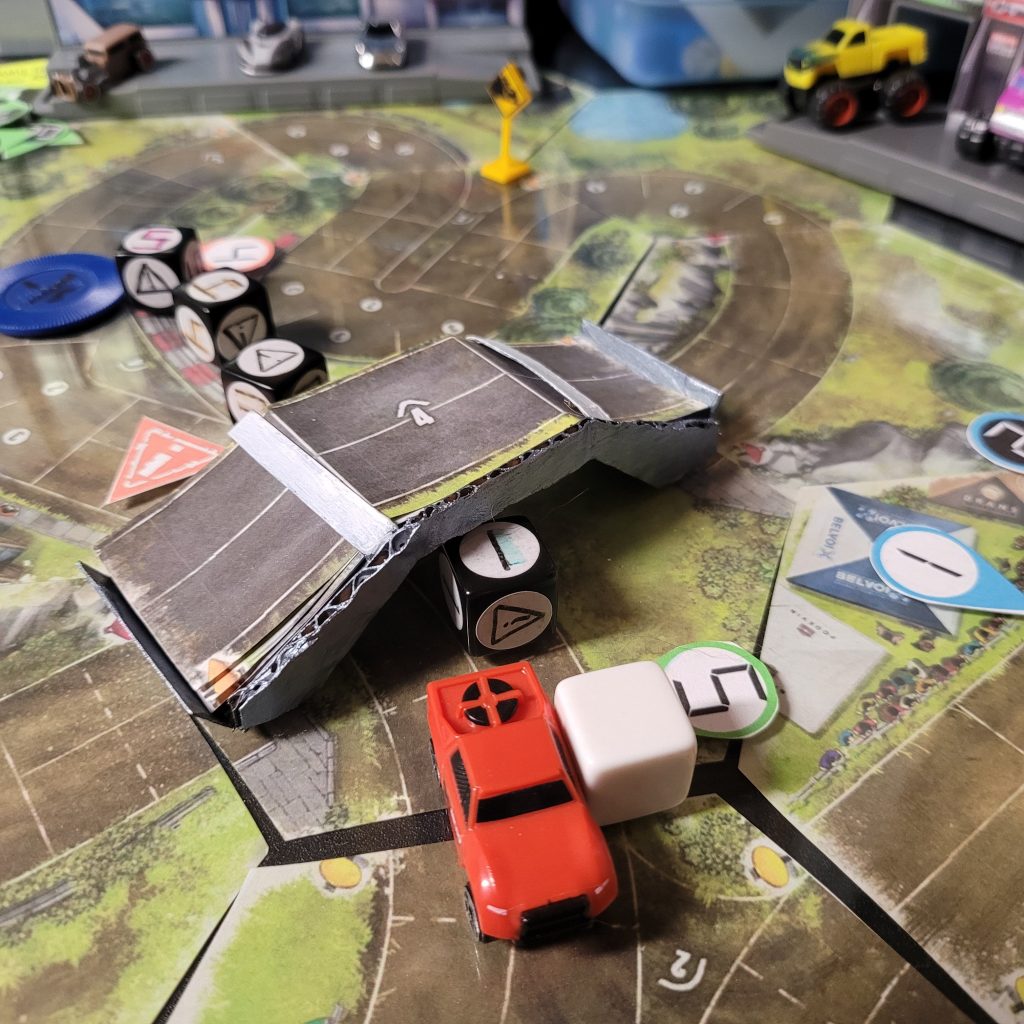 There’s a water hazard up ahead, and you can only be in gear 1 or coast to get through the space, and leader dice are just spicier coast dice with an extra caution result.