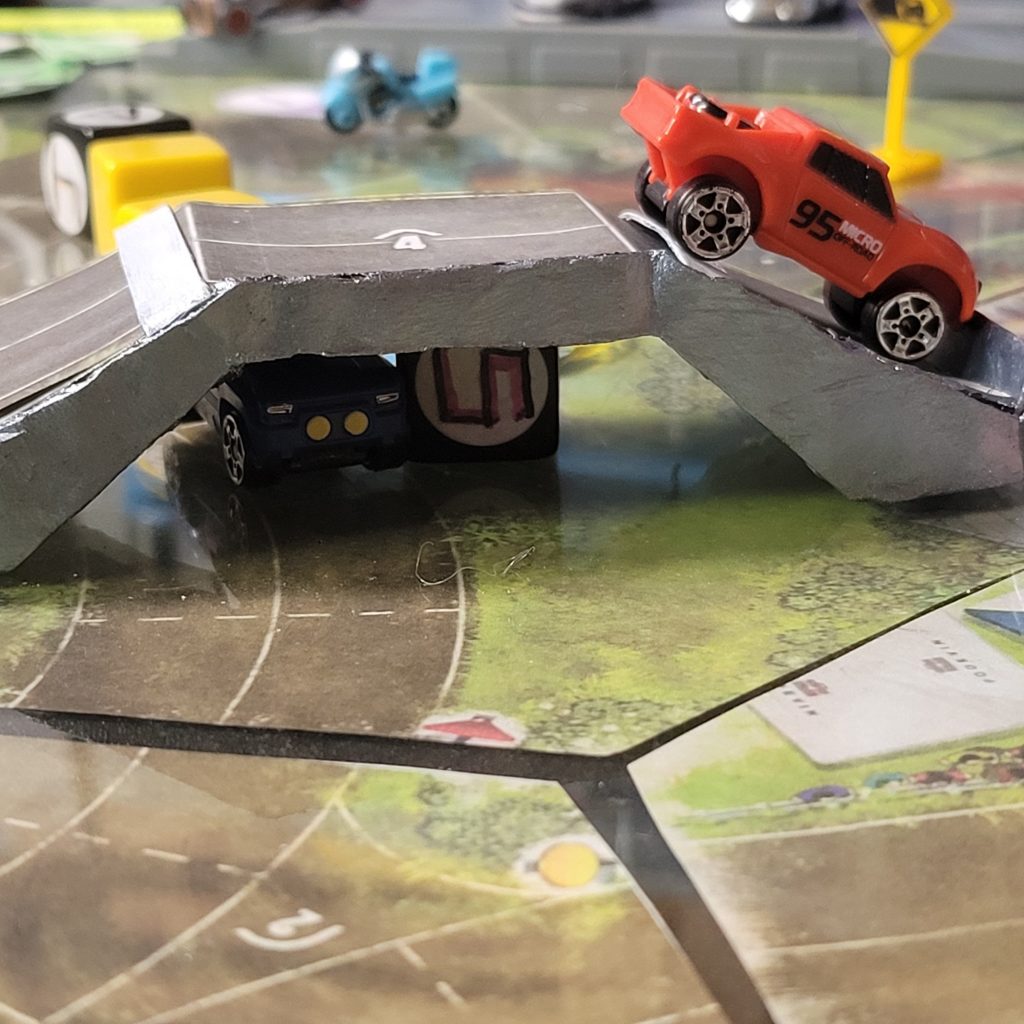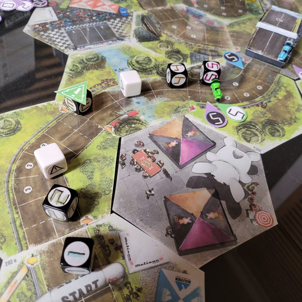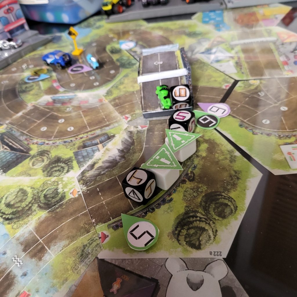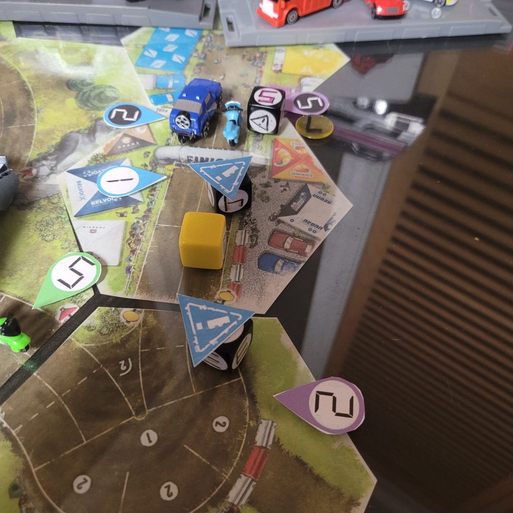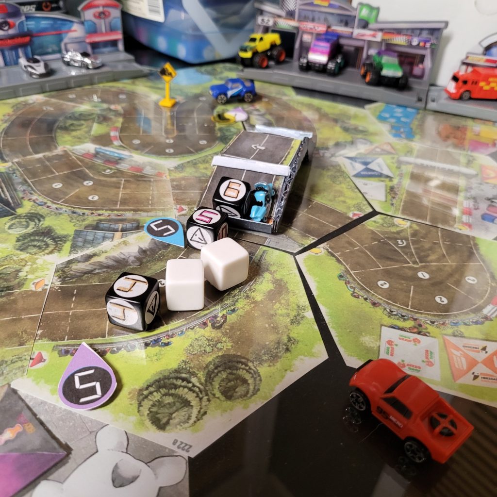 There’s a water hazard up ahead, and you can only be in gear 1 or coast to get through the space, and leader dice are just spicier coast dice with an extra caution result.