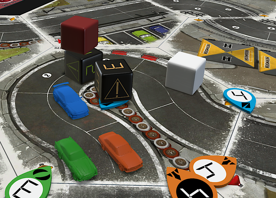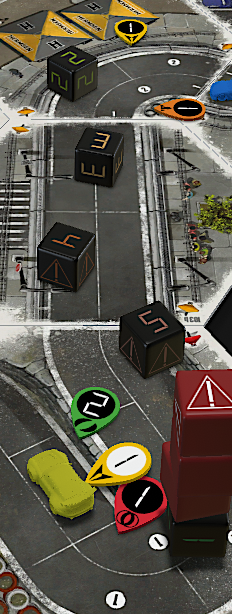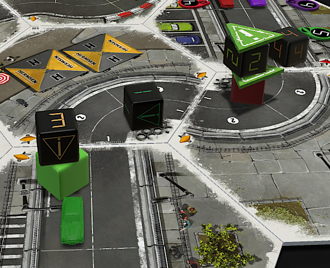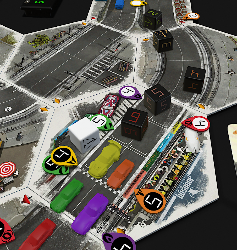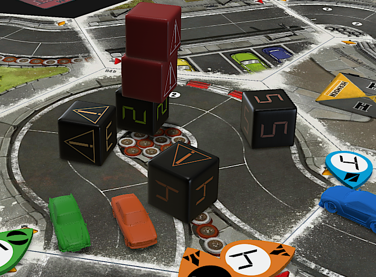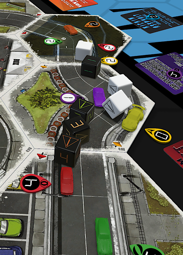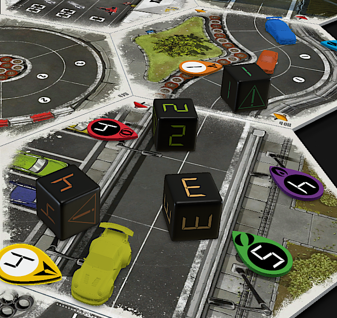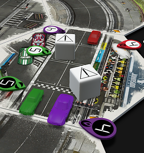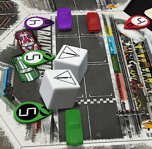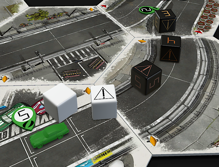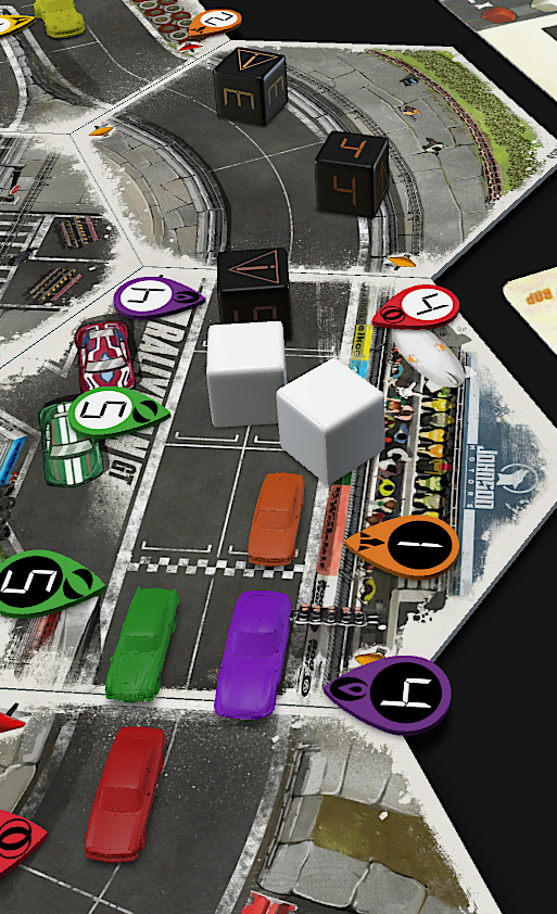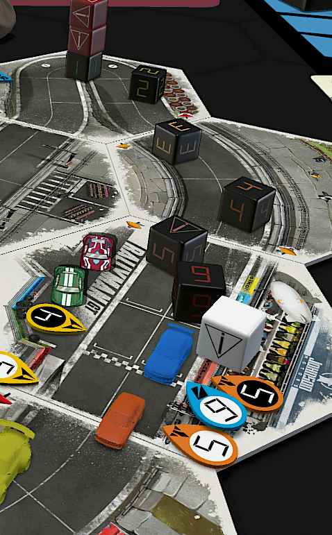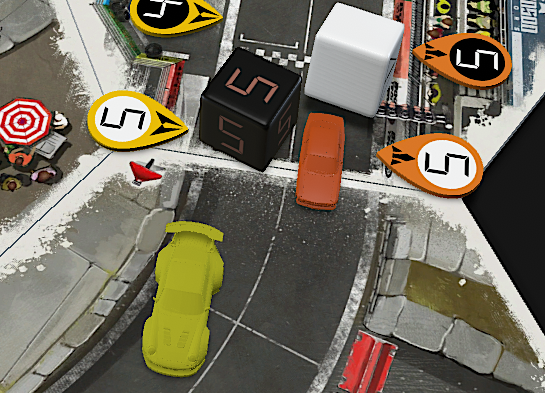 Last to move, the GT-5 at least has a boost dice to try and get through the parking lot next turn.