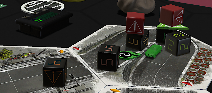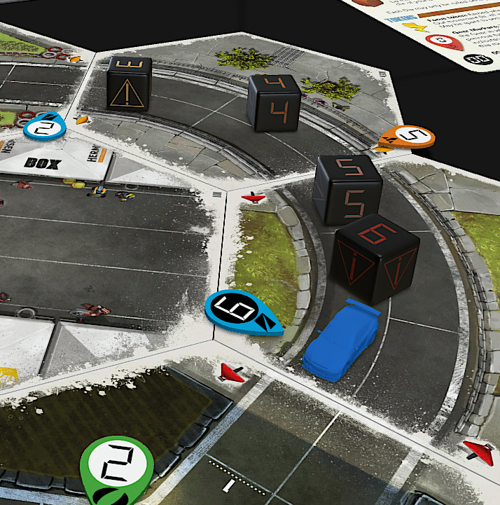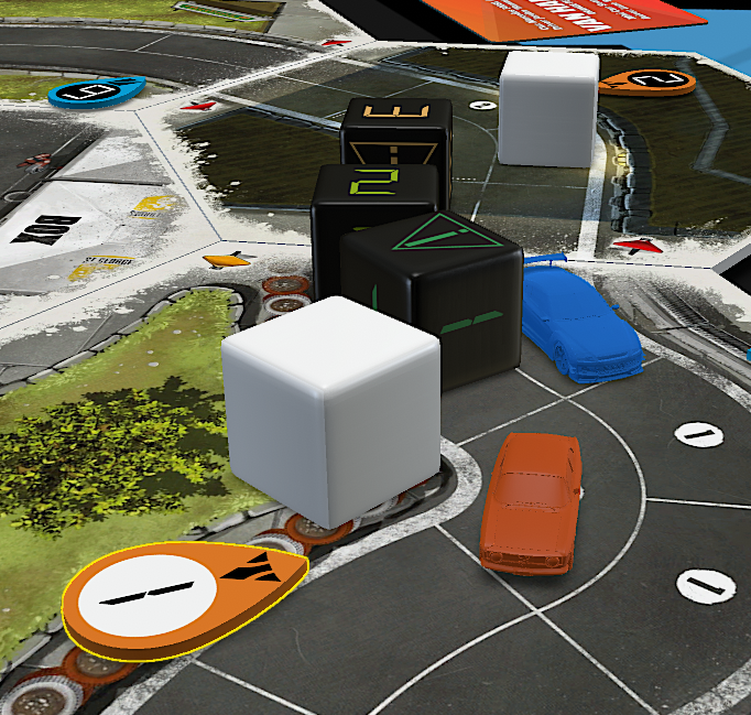 Mule is trying something complicated… with so few dice, he’s hitting the corner too hard to get a loss of control in second, which just stops his movement and sets his Gear to 0. We’ll have to see if this gamble pays off next turn after the parking lot catching up.