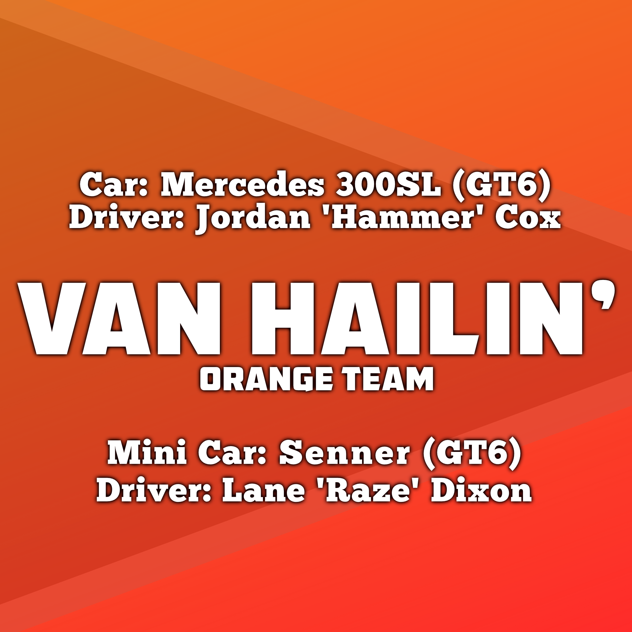 1. Van Hailin’ – Jordan ‘Hammer’ Cox in the orange Mercedes 300 SL (GT-5) – 25 Season Points
