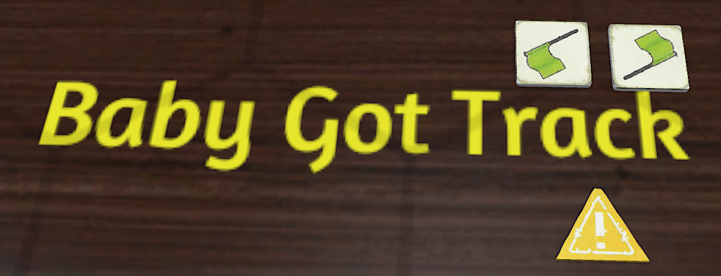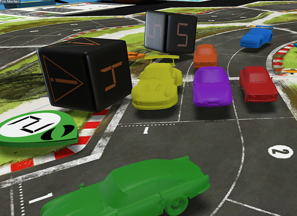 Swagger suffers no direct ill effect, but the crash was as loud as thunder, and now the rail is starting to fall at Tour de Tabletop. All six cars are in Asphalt Tires instead of Rain Tires, so they’ll be using the Wet side of the Dashboards until they can make a Pit Stop to change to Rain Tires.