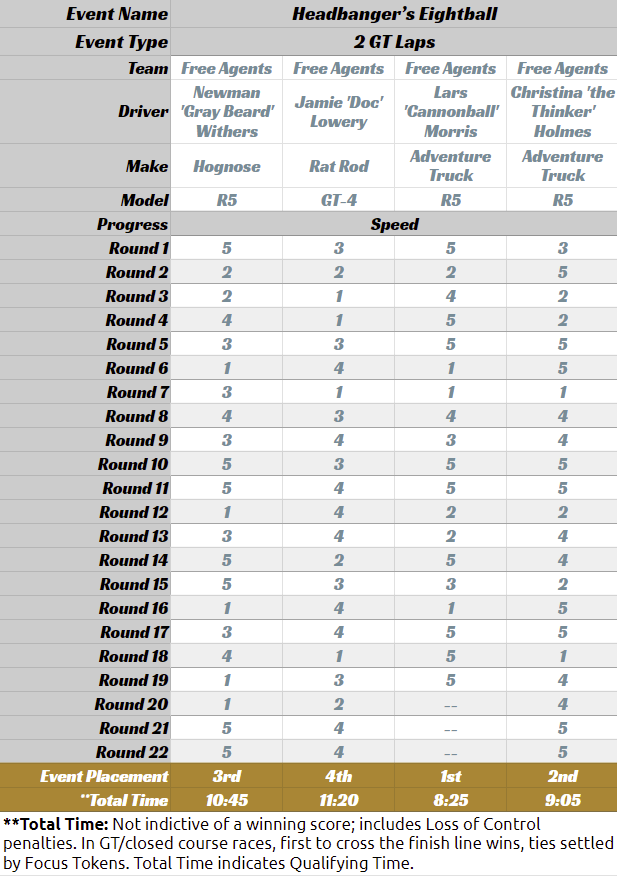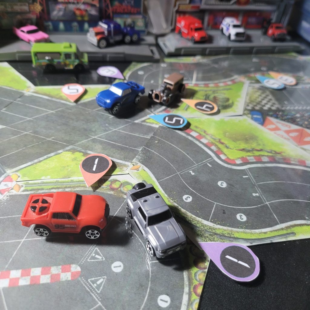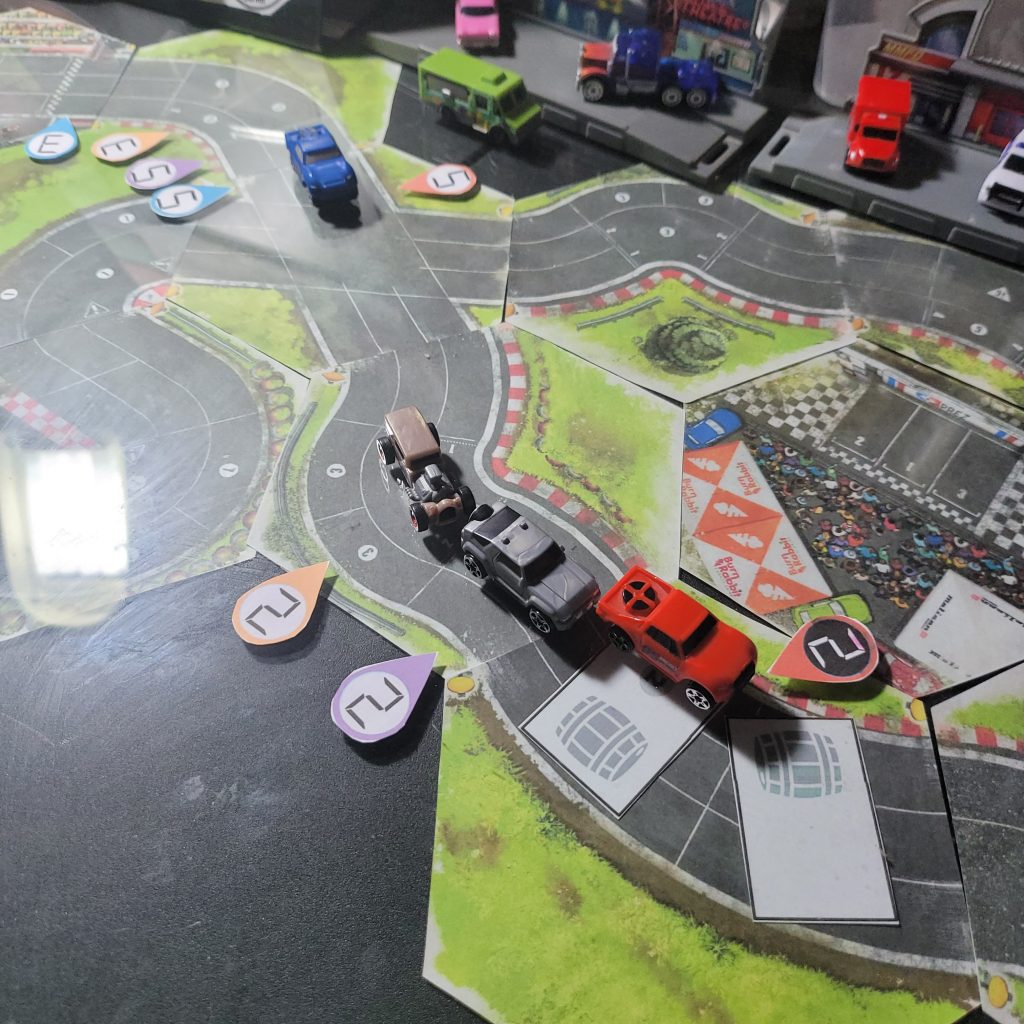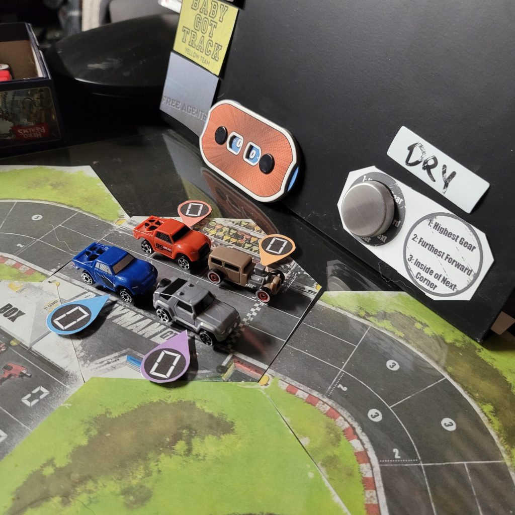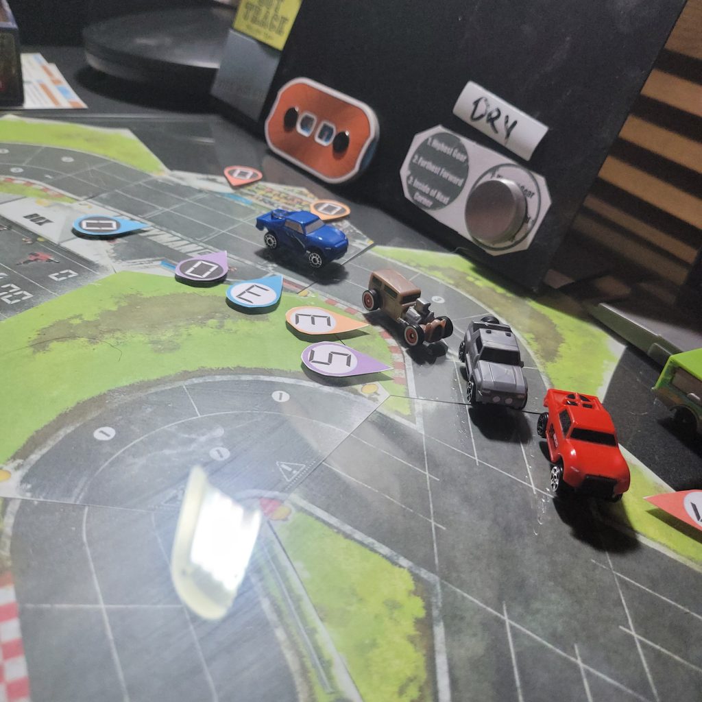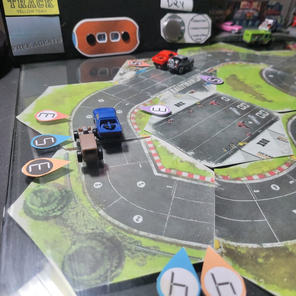 - HEATED WHEELS: All racers go FLAT OUT each turn but gain no Focus. Course trajectory is laid out after the roll is made, and caution results are still observed.