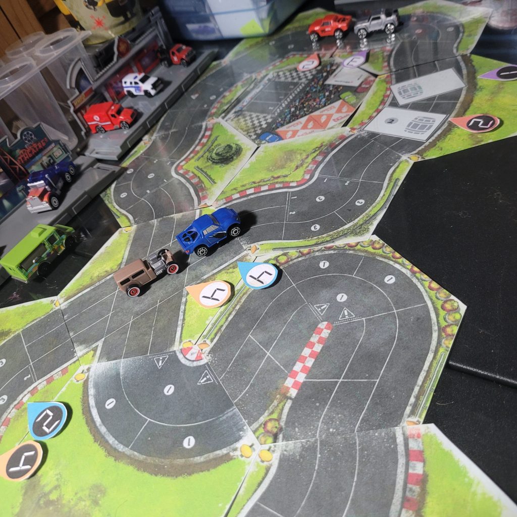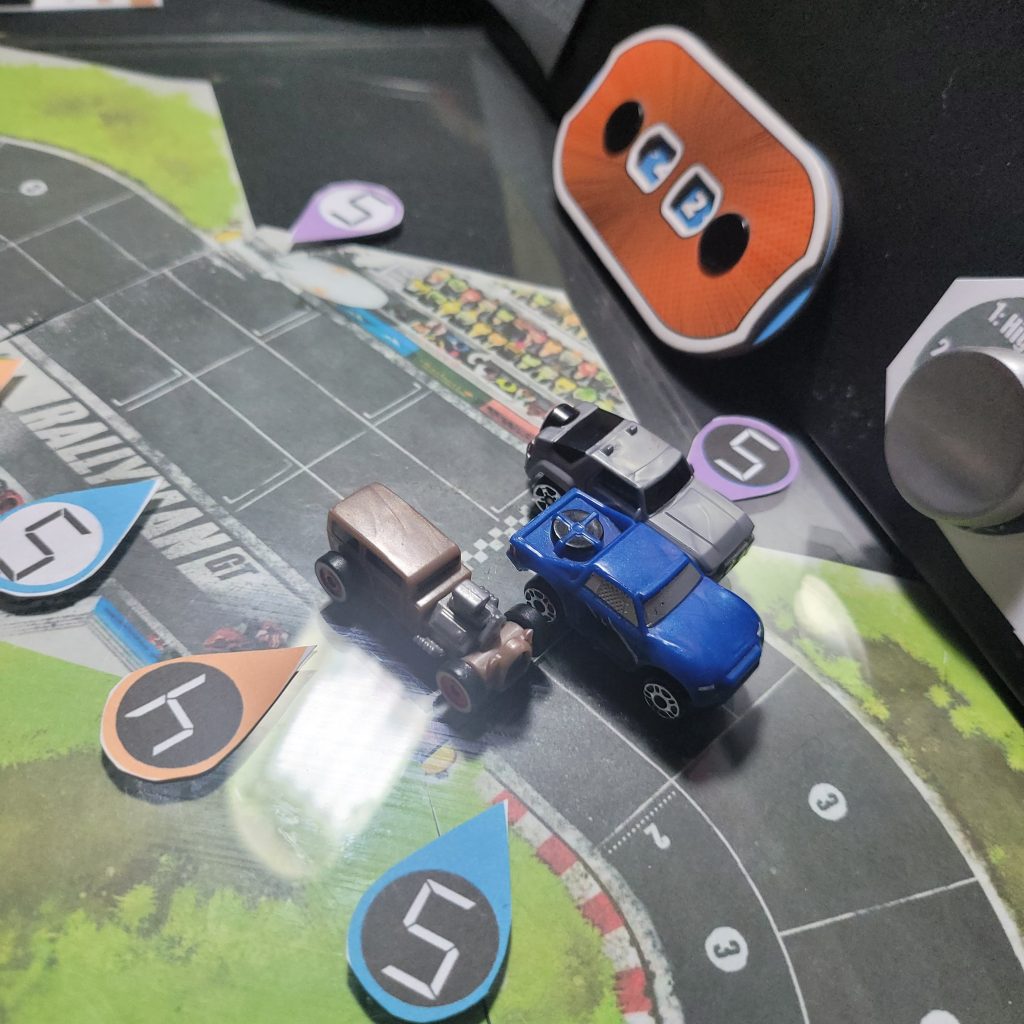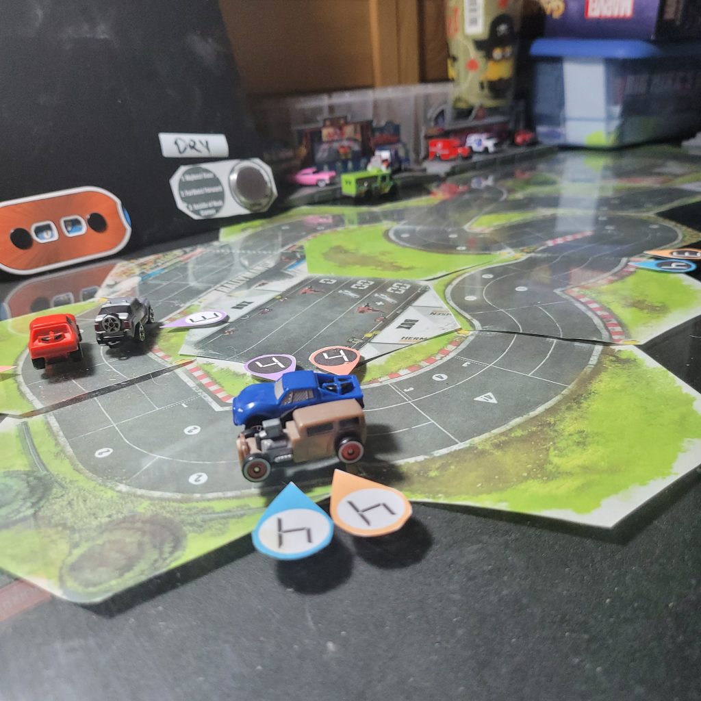 Now The Thinker’s faster Adventure Truck is an advantage, as Doc’s Rat Rod can’t get up to passing speed and is now stuck in back.