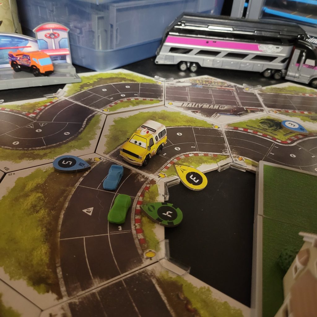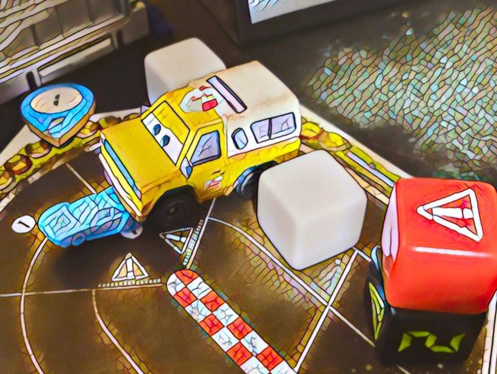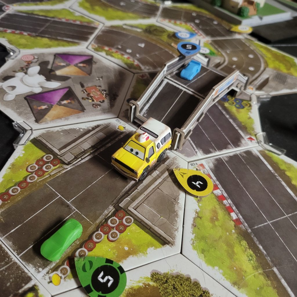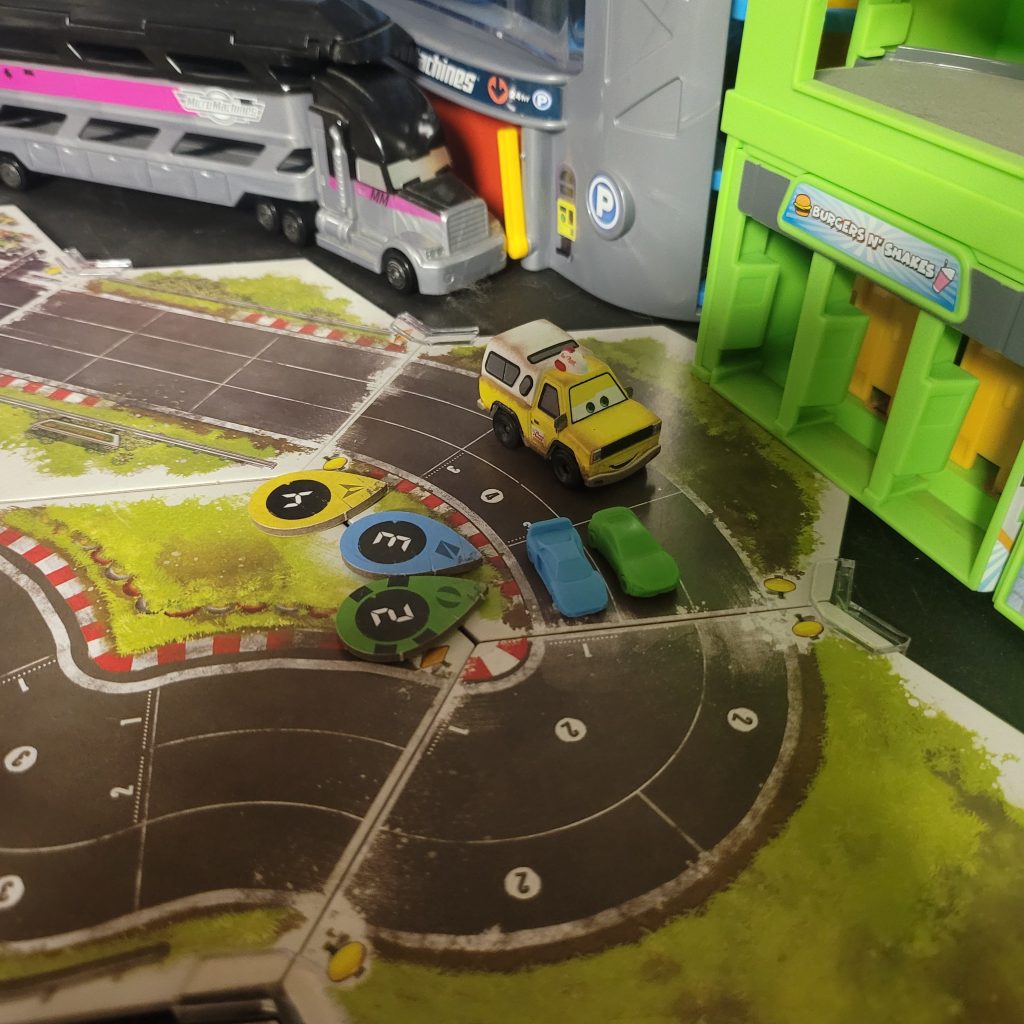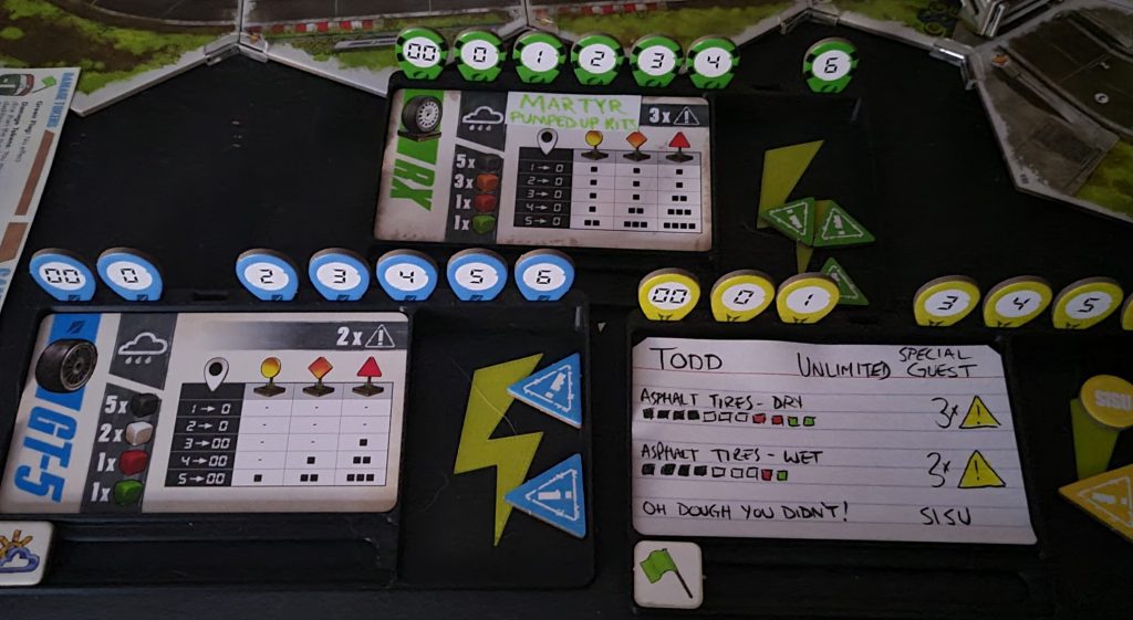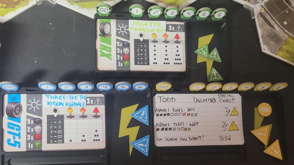 Three-Teeth not so much; Martyr and Todd braked hard to and gunned it, but Driscoll’s dice showed too many cautions for that so he had to settle for coasting and he has the fewest dice there.
