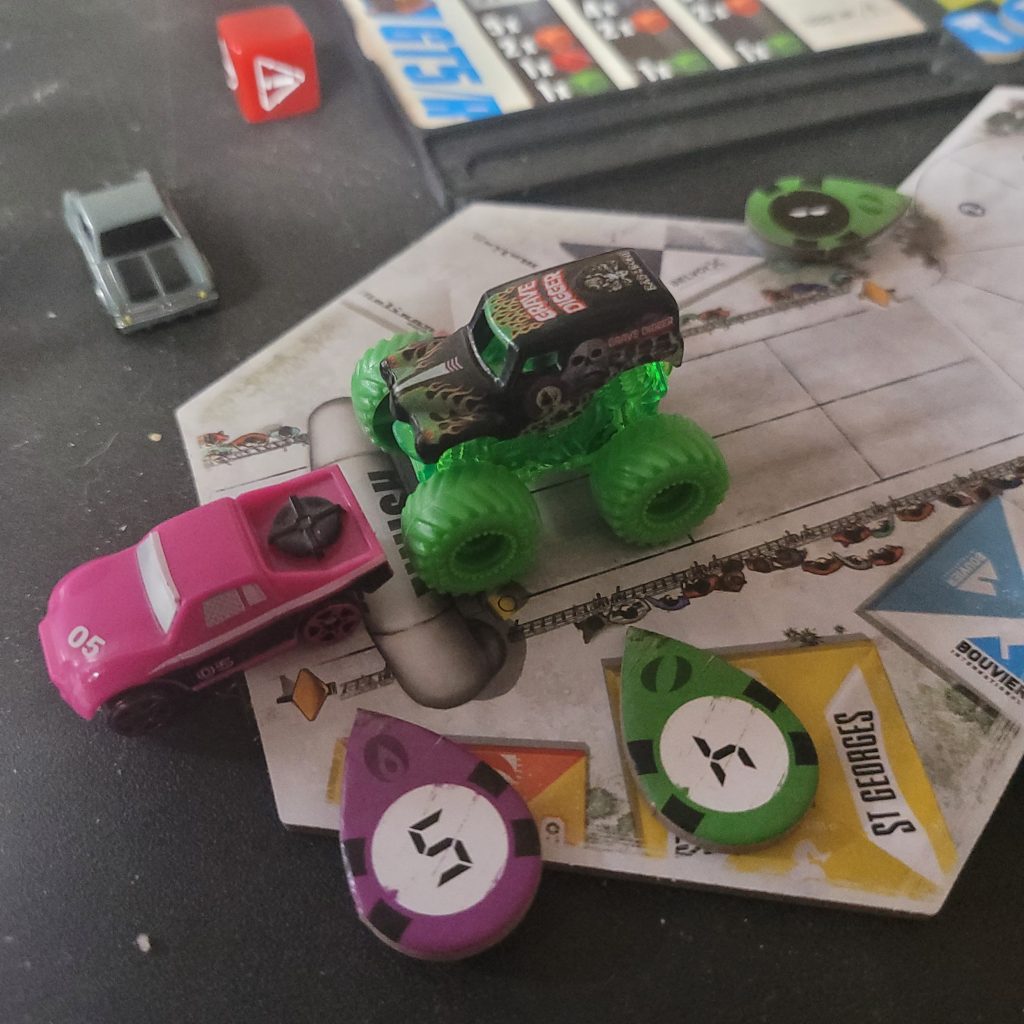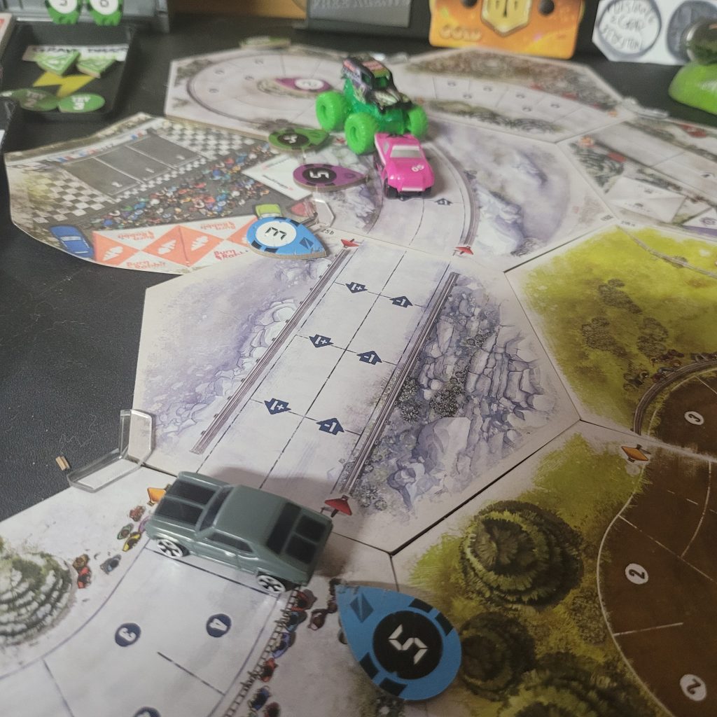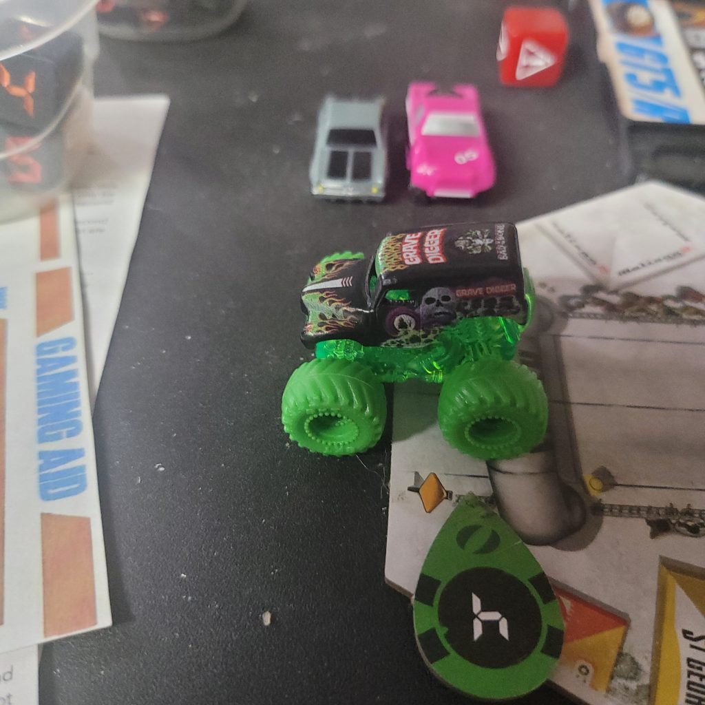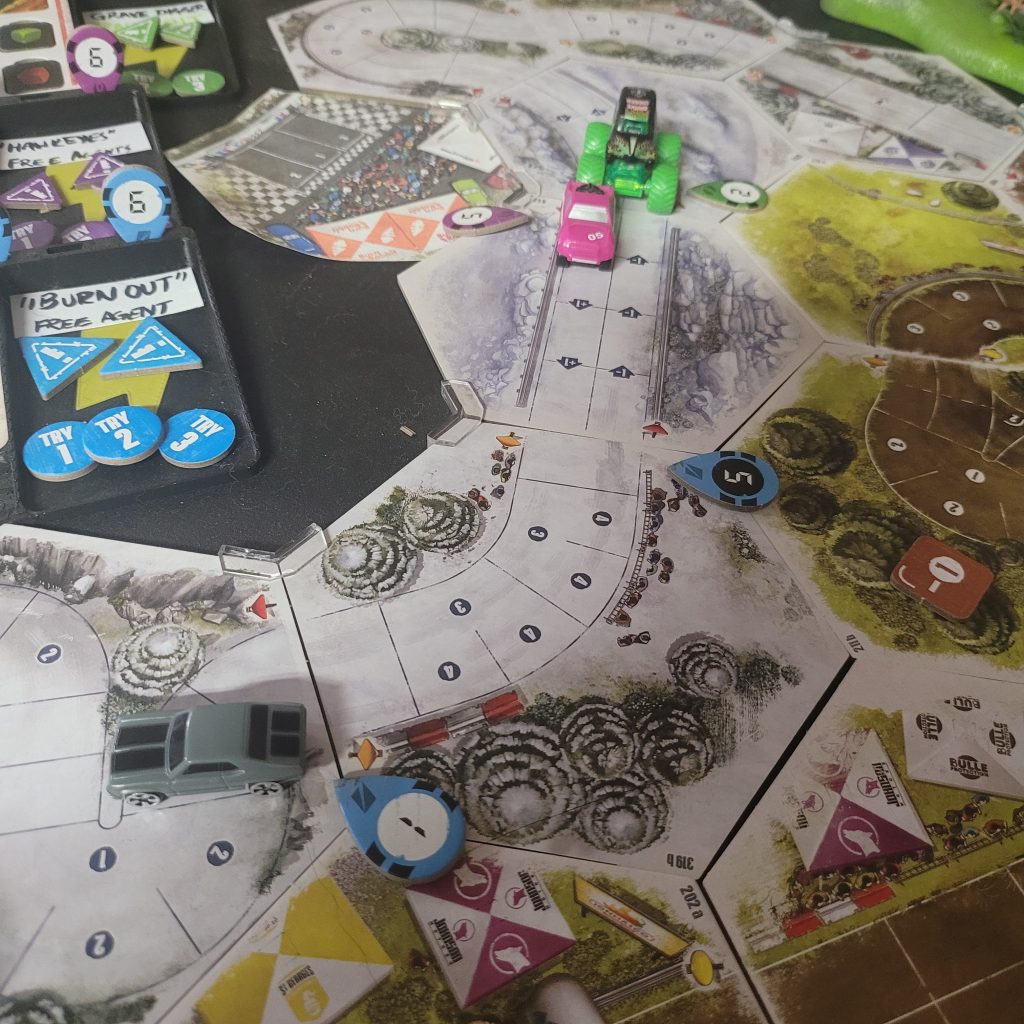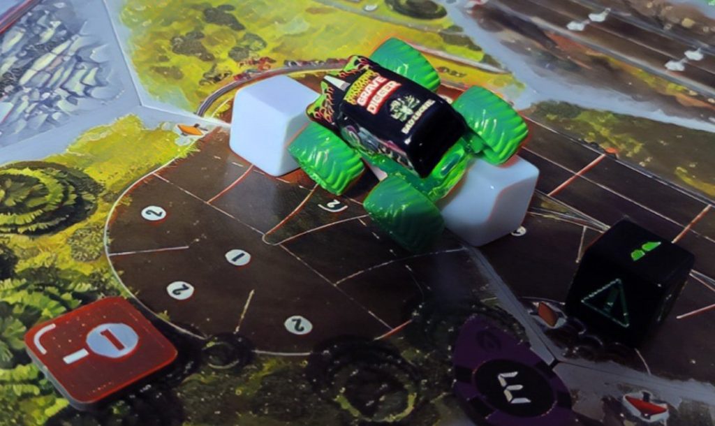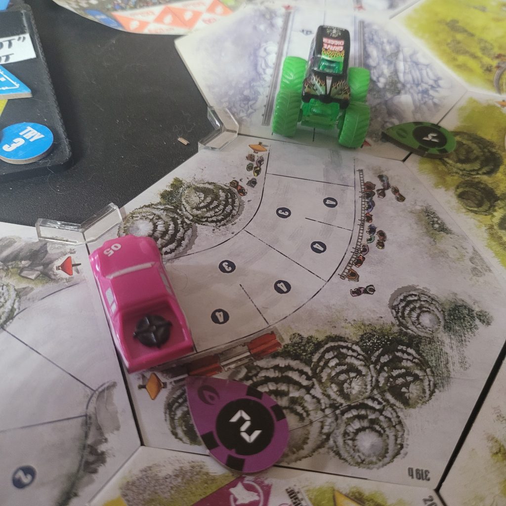 Grave Digger is gonna show everyone how it’s done. Barreling through that first shortcut, he has to draw from the Damage Token Bag, but his “A Little Dirt Never Hurt Nobody” lets him draw twice when suffering damage from the track and choose a token to keep. Between Weather Change and -1 Speed, he chose the latter. The speed limit on that hex is lowered as dirt and rocks — and probably whole trees — are sprayed out all over the track to make room for the monster.