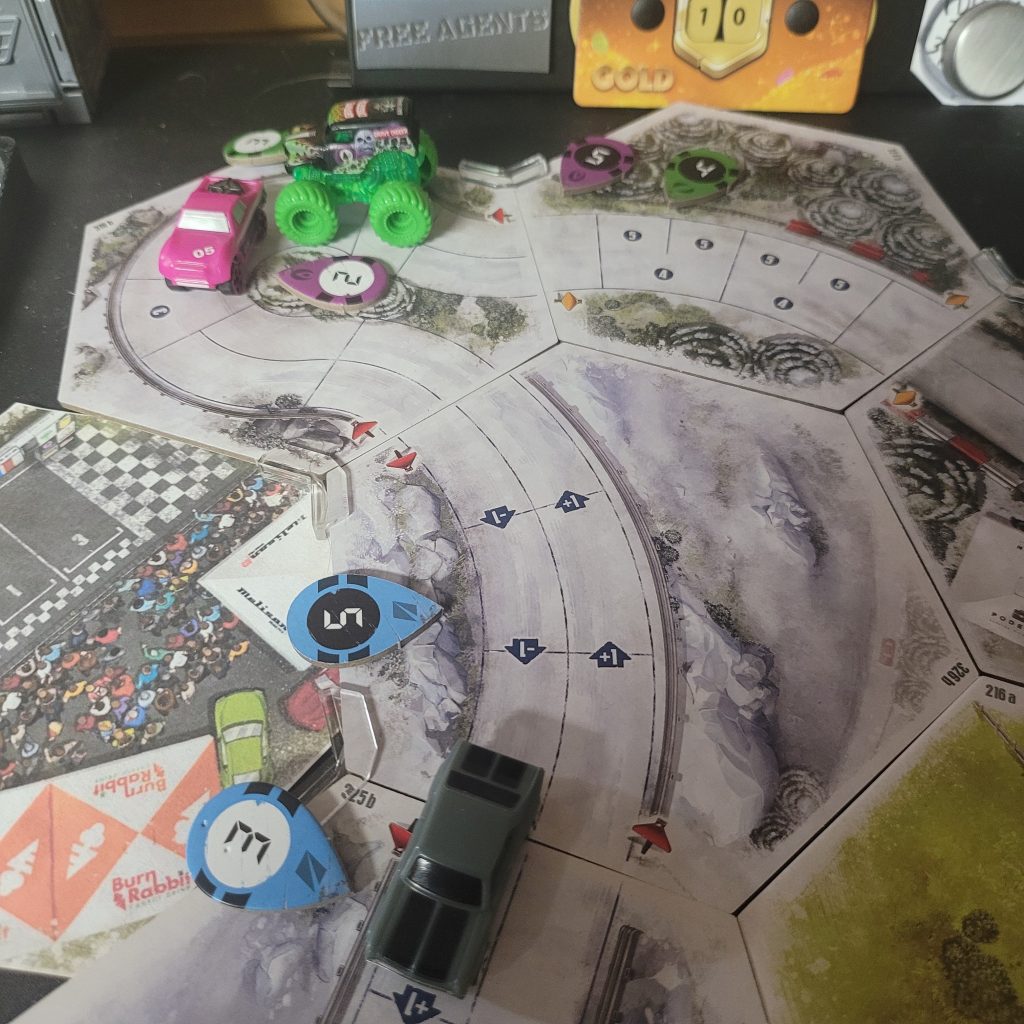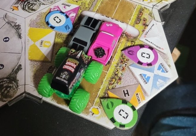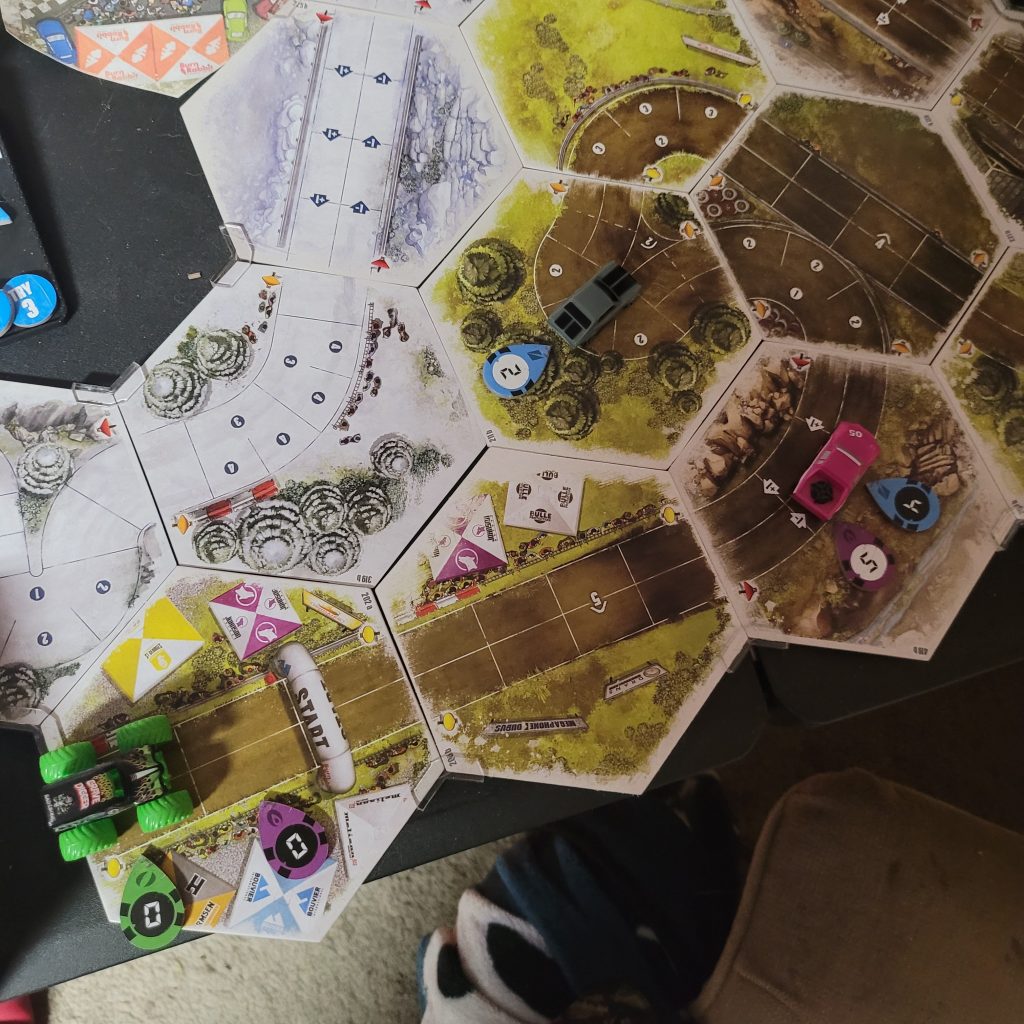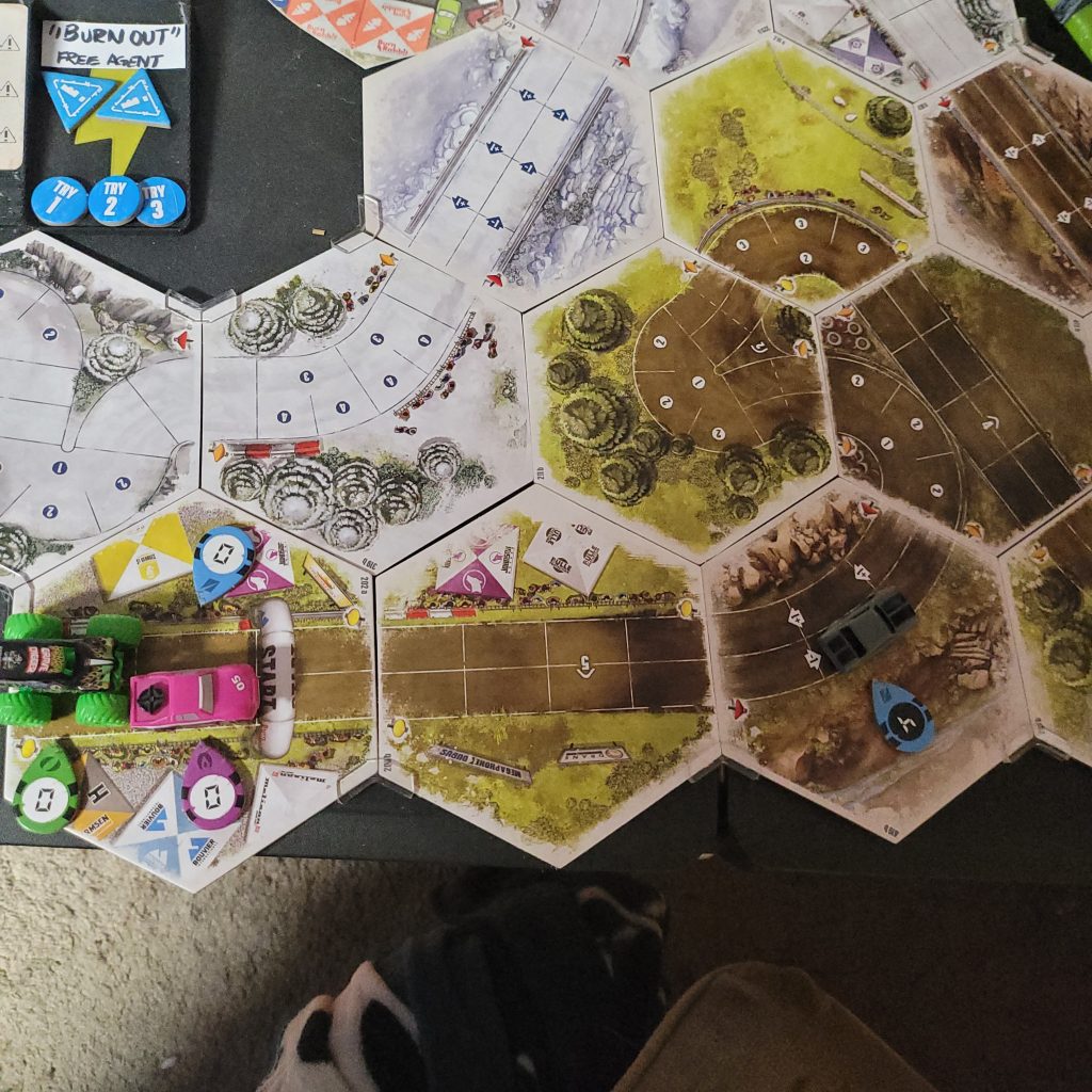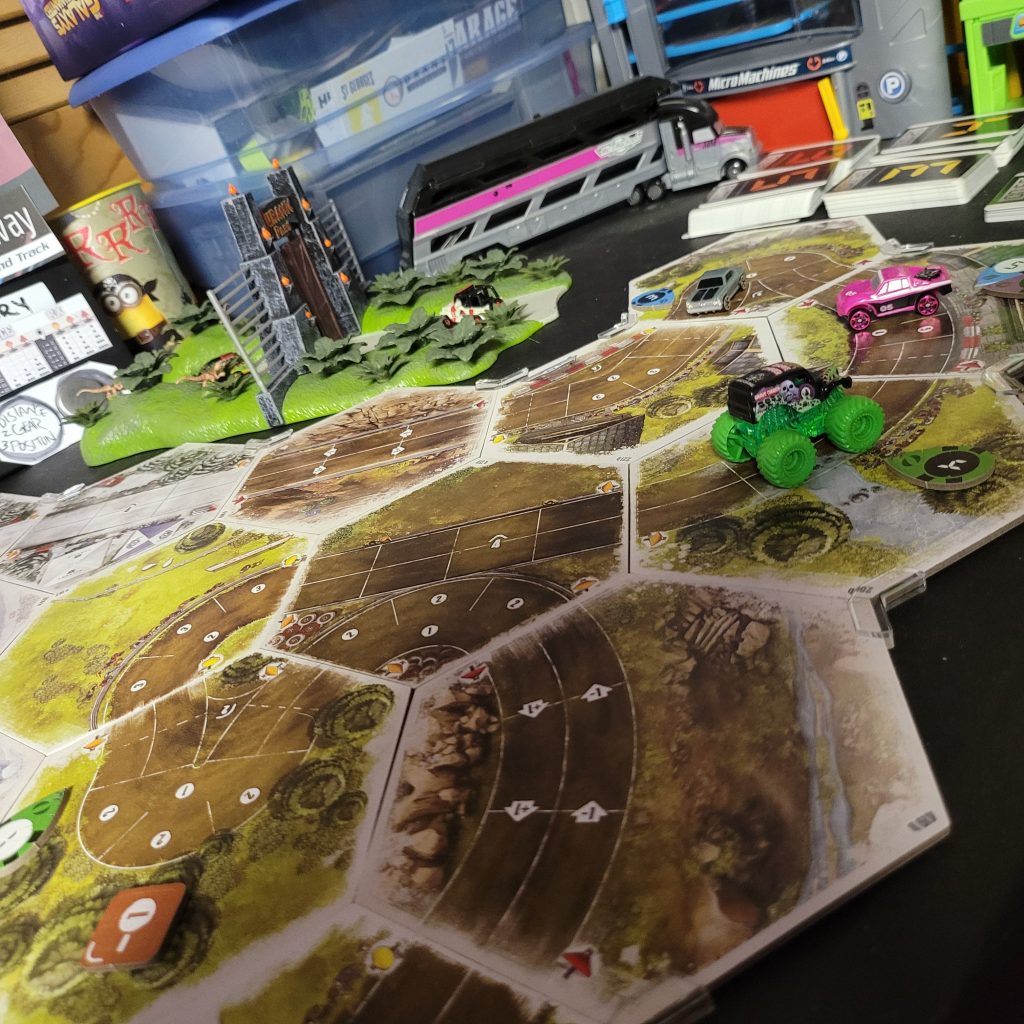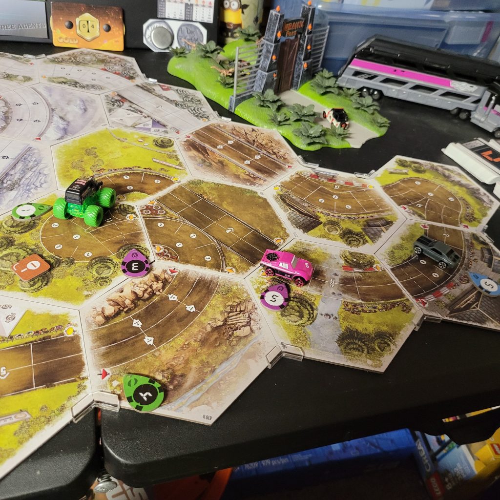 Grave Digger is gonna show everyone how it’s done. Barreling through that first shortcut, he has to draw from the Damage Token Bag, but his “A Little Dirt Never Hurt Nobody” lets him draw twice when suffering damage from the track and choose a token to keep. Between Weather Change and -1 Speed, he chose the latter. The speed limit on that hex is lowered as dirt and rocks — and probably whole trees — are sprayed out all over the track to make room for the monster.