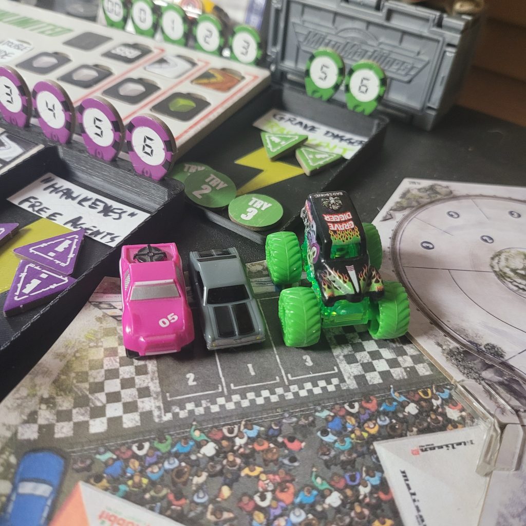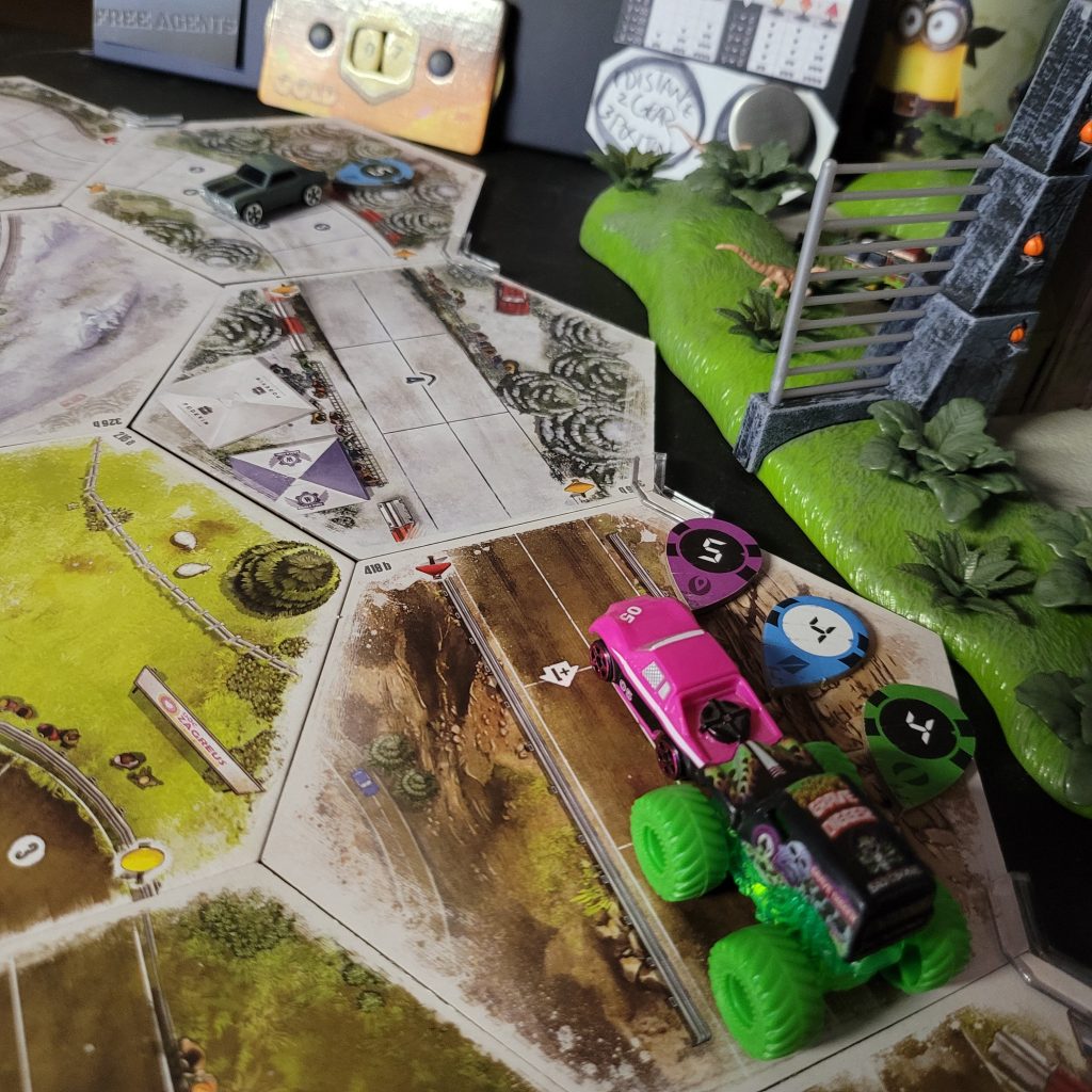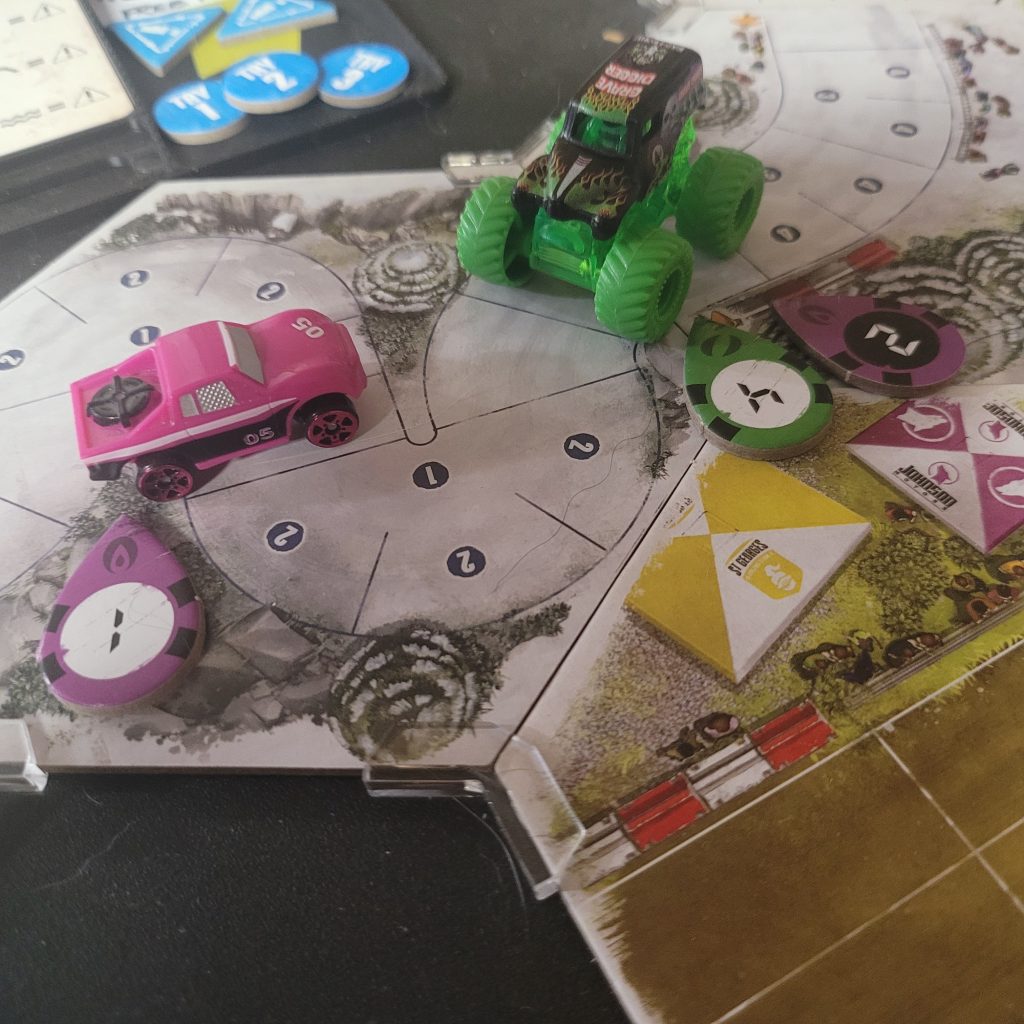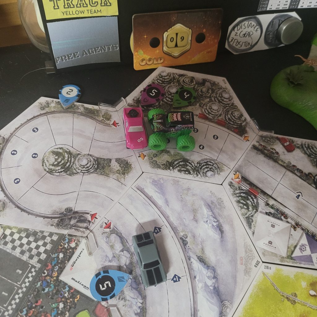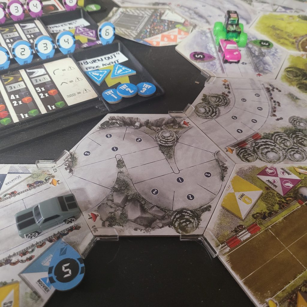 Grave Digger is gonna show everyone how it’s done. Barreling through that first shortcut, he has to draw from the Damage Token Bag, but his “A Little Dirt Never Hurt Nobody” lets him draw twice when suffering damage from the track and choose a token to keep. Between Weather Change and -1 Speed, he chose the latter. The speed limit on that hex is lowered as dirt and rocks — and probably whole trees — are sprayed out all over the track to make room for the monster.