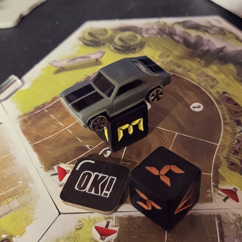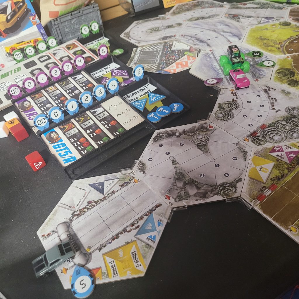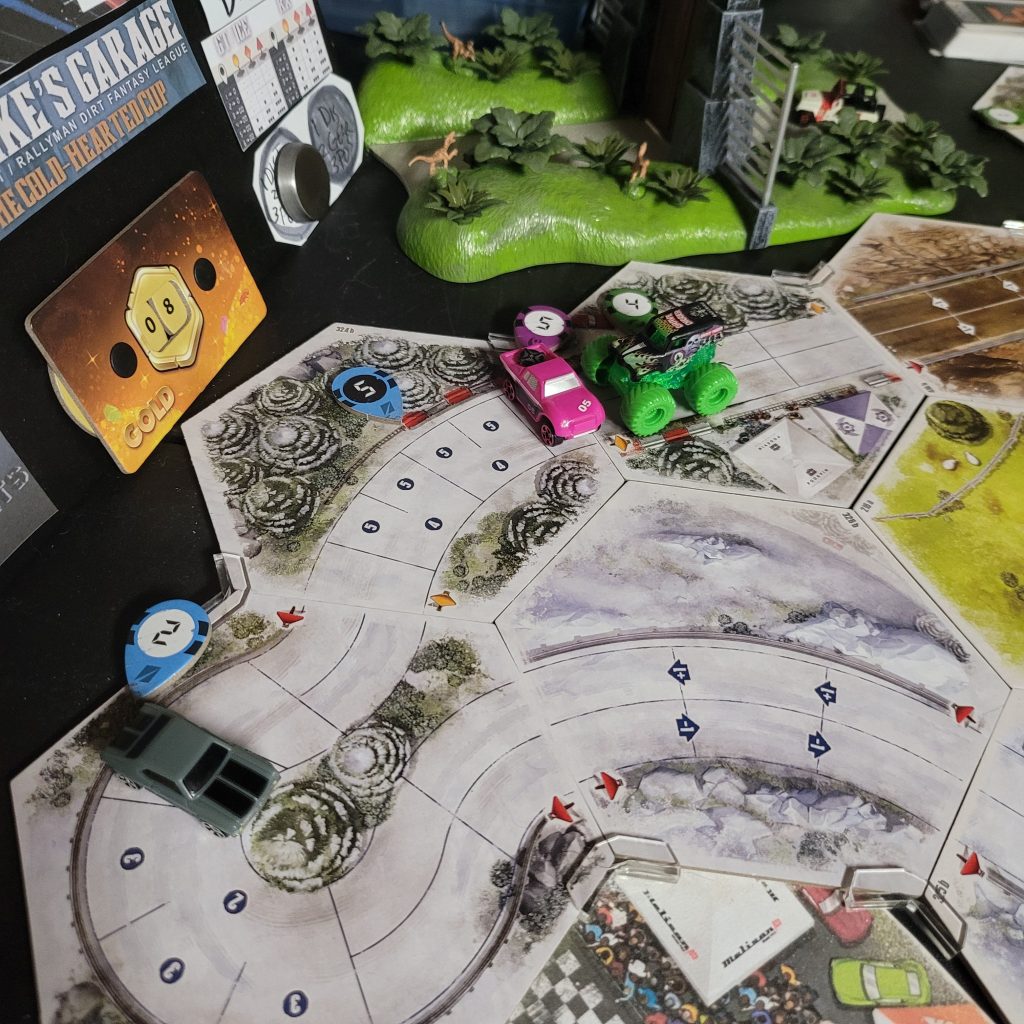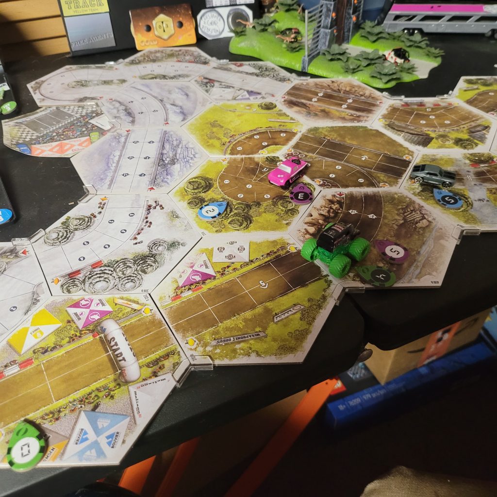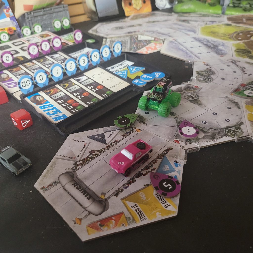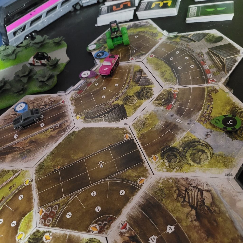 Grave Digger is gonna show everyone how it’s done. Barreling through that first shortcut, he has to draw from the Damage Token Bag, but his “A Little Dirt Never Hurt Nobody” lets him draw twice when suffering damage from the track and choose a token to keep. Between Weather Change and -1 Speed, he chose the latter. The speed limit on that hex is lowered as dirt and rocks — and probably whole trees — are sprayed out all over the track to make room for the monster.